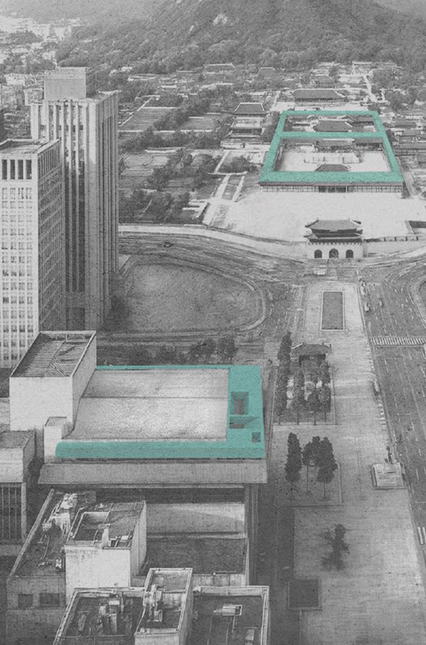 한국 전통 건축은 지붕-기둥-기단에 이르는 비례가 3:2:1의 위계를 이루며 상부 요소가 중심이 되는 비례체계를 가진다. 반면, 세종문화회관의 입면은 1:2: 1의 구성으로 이루어져, 전통적 비례와는 또 다른 수직적 균형감과 입면의 구성방식을 보여준다. 우리는 이 차이를 건축적 해석의 출발점으로 삼았으며, 결여된 비례체계를 보완하여 건물에 편안하고 자연스러운 인상을 더하고, 광화문 도시풍경의 일관성을 유지하고자 한다. 이를 위해 세종문화회관 위에 기존 지붕각도로 얹어지는 새로운 지붕을 계획하여 도시와 맞닿는 또 하나의 공공의 레이어를 형성하였다.