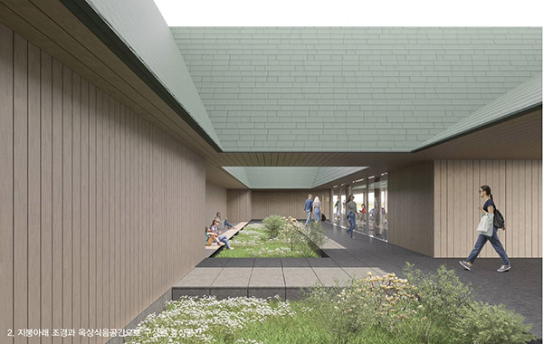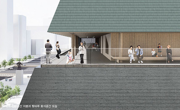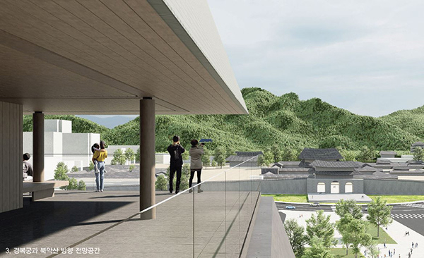 외부에서는 옥상 공간이 수평으로 크게 열려 보이지만, 내부에서는 위치와 높이에 따라 시각적 경험이 달라지고 이동 흐름에 따라 도시를 다양한 방향으로 조망할 수 있도록 계획하였다. 이러한 시선 구성은 전통건축의 회랑과 행각에서 착안해 세종문화회관의 환경에 맞게 재해석한 것으로, 내부로 향하던 전통적 시선을 도시를 향해 확장한 것이다. 새로운 지붕으로 형성된 틈' 공간은 높낮이를 조정해 이동하고 머무르는 동안 시선이 서로 겹치지 않 도록 구성하였으며, 이를 통해 도시 풍경을 단일한 조망이 아닌 다양한 높이와 각도 방향에서 바라볼 수 있도록 했다.
